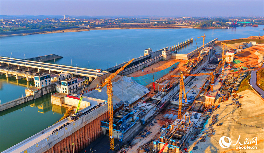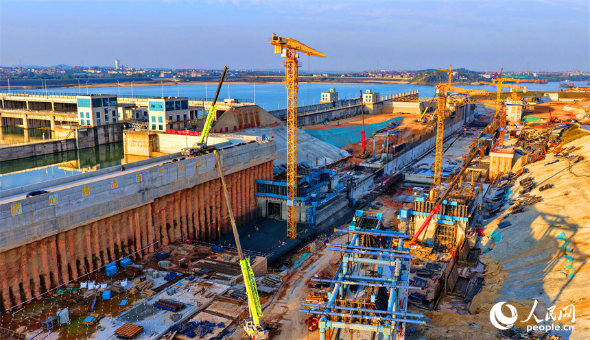 人民网丰城11月27日电 (记者朱海鹏)近日,位于江西省丰城市的赣江龙头山枢纽塔吊林立,工人在加紧建设水利枢纽二线船闸。