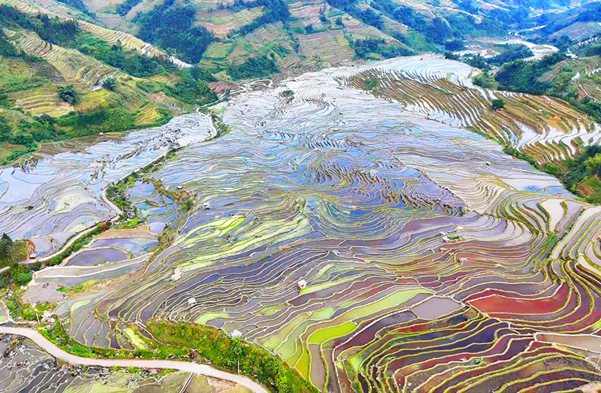 人民网绿春11月27日电 初冬时节,云南省红河哈尼族彝族自治州绿春县的腊姑梯田“上新”啦!航拍视角下,灌满水的梯田波光潋滟、层层叠叠错落有致,静静镶嵌于翠绿的山峦之间,仿佛一面面镜子,又恰似一盘大自然私藏的冬日限定“鎏金眼影盘”。(曾智慧、李雪丽、陆雨堂)